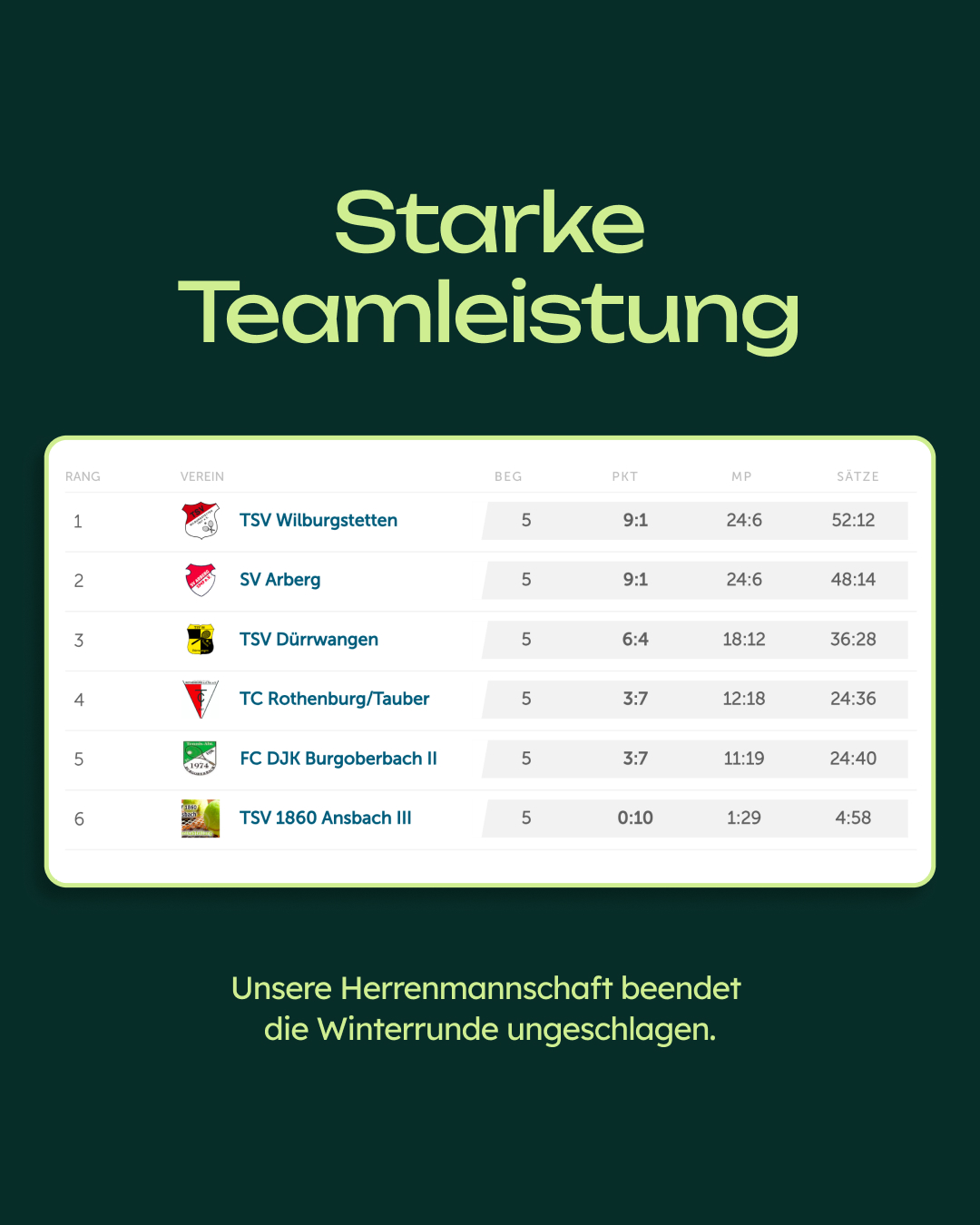 Unsere Herrenmannschaft hat die Winterrunde 2025/2026 des Bayerischen Tennisverbandes in der Nordliga 4 (Gruppe 037) erfolgreich abgeschlossen. Mit einer starken Bilanz von vier Siegen und einem Unentschieden sicherte sich das Team souverän den ersten Platz. Damit krönt unsere Mannschaft ihre Leistung nicht nur mit der Meisterschaft, sondern steigt zugleich in die Nordliga 3 auf. Der Erfolg unterstreicht die geschlossene Teamleistung und die konstante Form über die gesamte Saison hinweg.